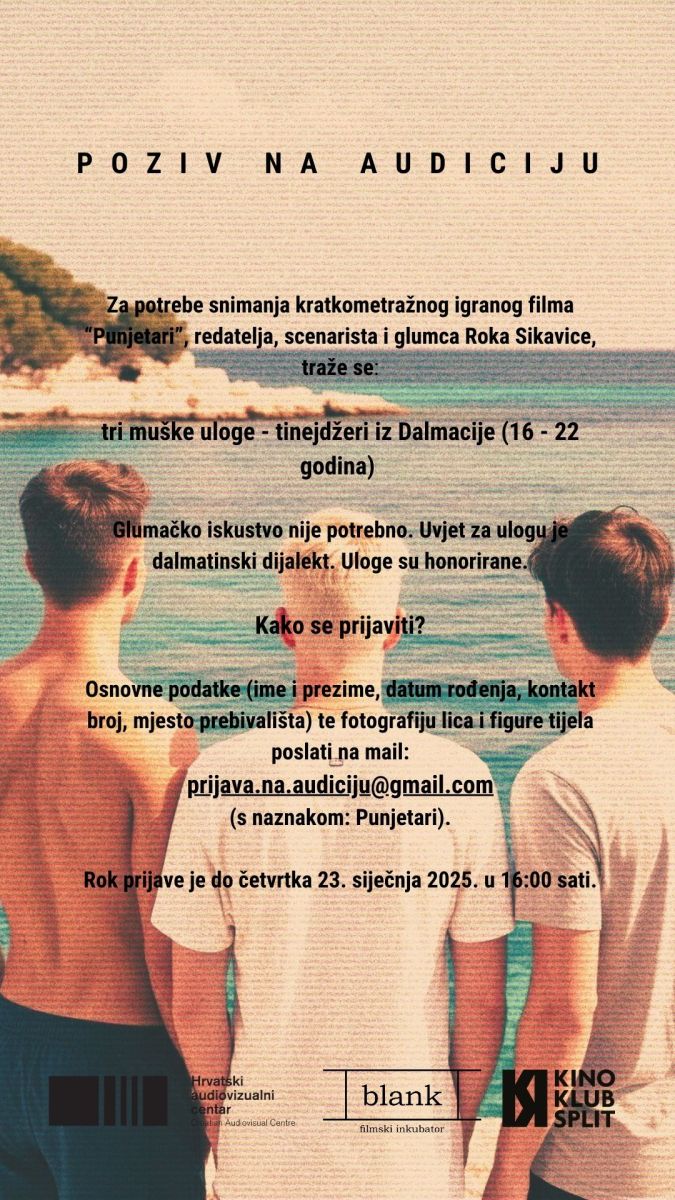 za potrebe snimanja kratkometražnog igranog filma „Punjetari“, redatelja, scenarista i glumca Roka Sikavice, a u produkciji Blanka i Kino kluba Split, traže se: