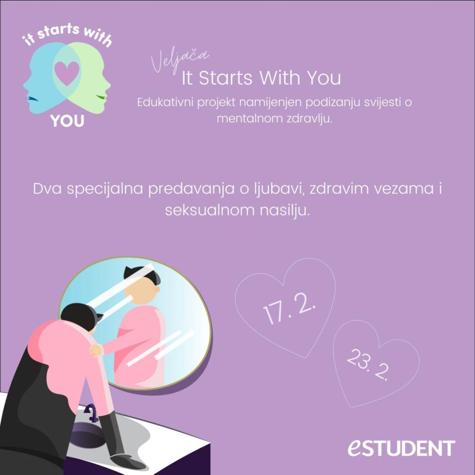 Projekt studentske udruge eSTUDENT namijenjen brizi o mentalnom zdravlju studenata pod nazivom „It starts with you“ ulazi u svoj drugi mjesec postojanja, a u mjesecu ljubavi poziva sve studente na radionicu o partnerskim odnosima i predavanje o nasilju u mladenačkim vezama koji će se održati u petak 17. veljače i četvrtak 23. veljače.