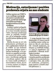 Svoj iskustva i dojmove naši su nam studenti i predavači dosad iskazali u anketi o zadovoljstvu online nastavom te u izjavama na društvenim mrežama. Kako izgleda rad sa studentima u online okruženju, kako se prate predavanja i surađuje na projektima, koje se šaljive situacije događaju za vrijeme predavanja, te što im svima nedostaje za Jutarnji list su otkrile naša profesorica psihologije doc. dr. sc. Irena Miljković Krečar te studentice Karla Gregl i Lea Švec Dumbović.