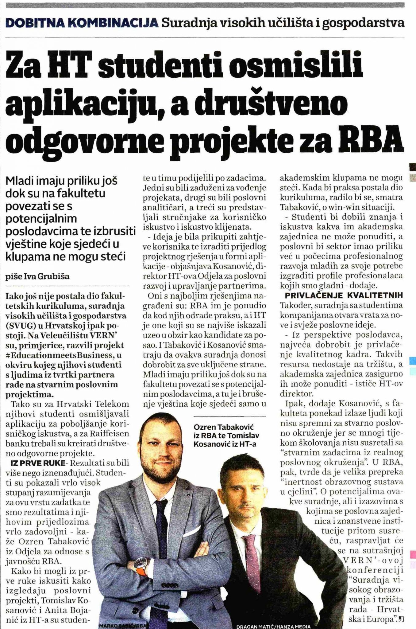 U današnjem broju Jutarnjeg lista, predstavljena su pozitivna iskustva poslodavaca koja su stekli kroz rad s VERN’ovim studentima u okviru projekta #EducationmeetsBusiness, koji povezuje visoko obrazovanje s tržištem rada na način da studenti zajedno s tvrtkama-partnerima surađuju na stvarnim poslovnim projektima.