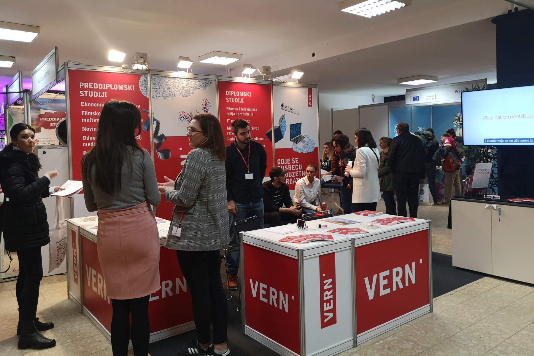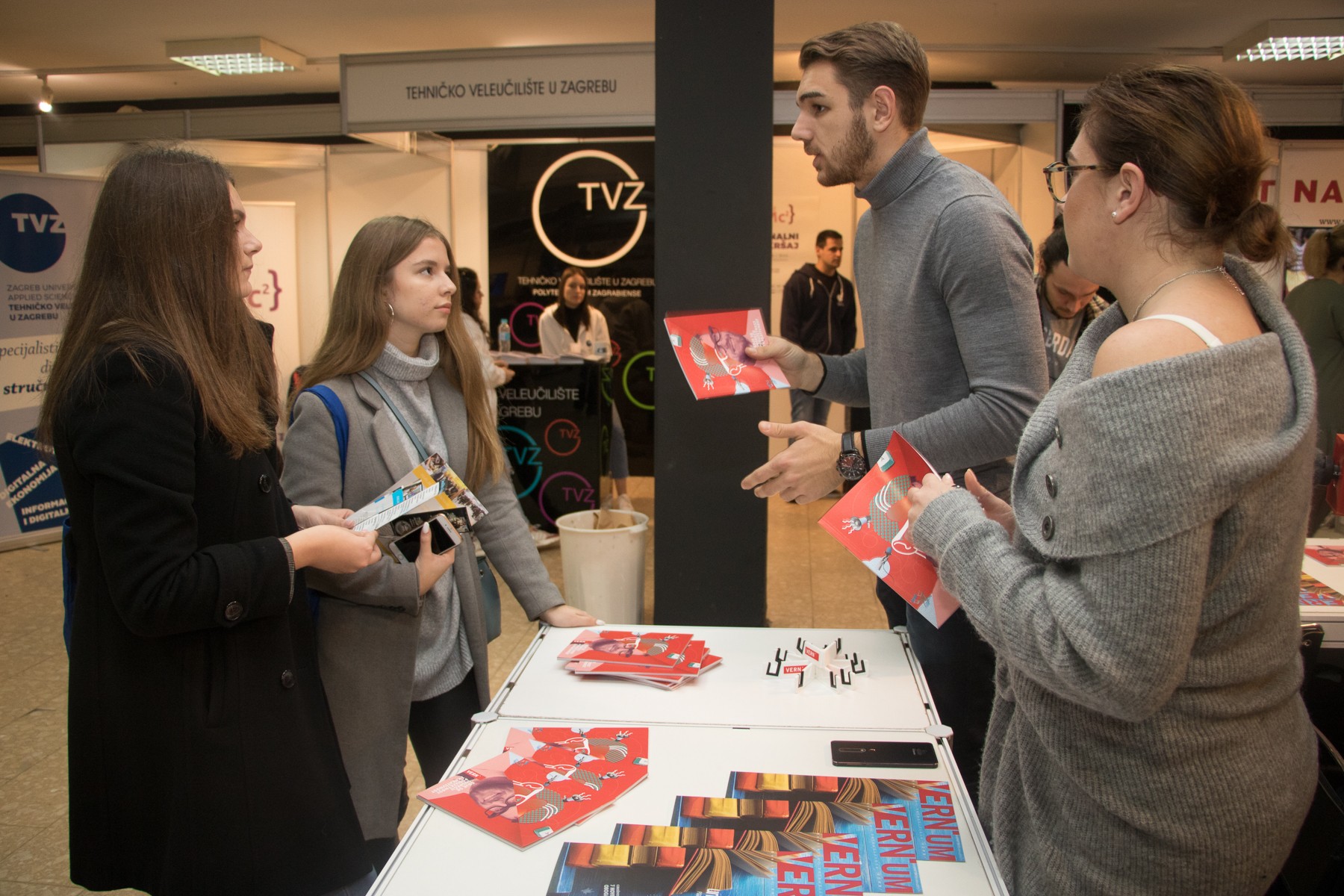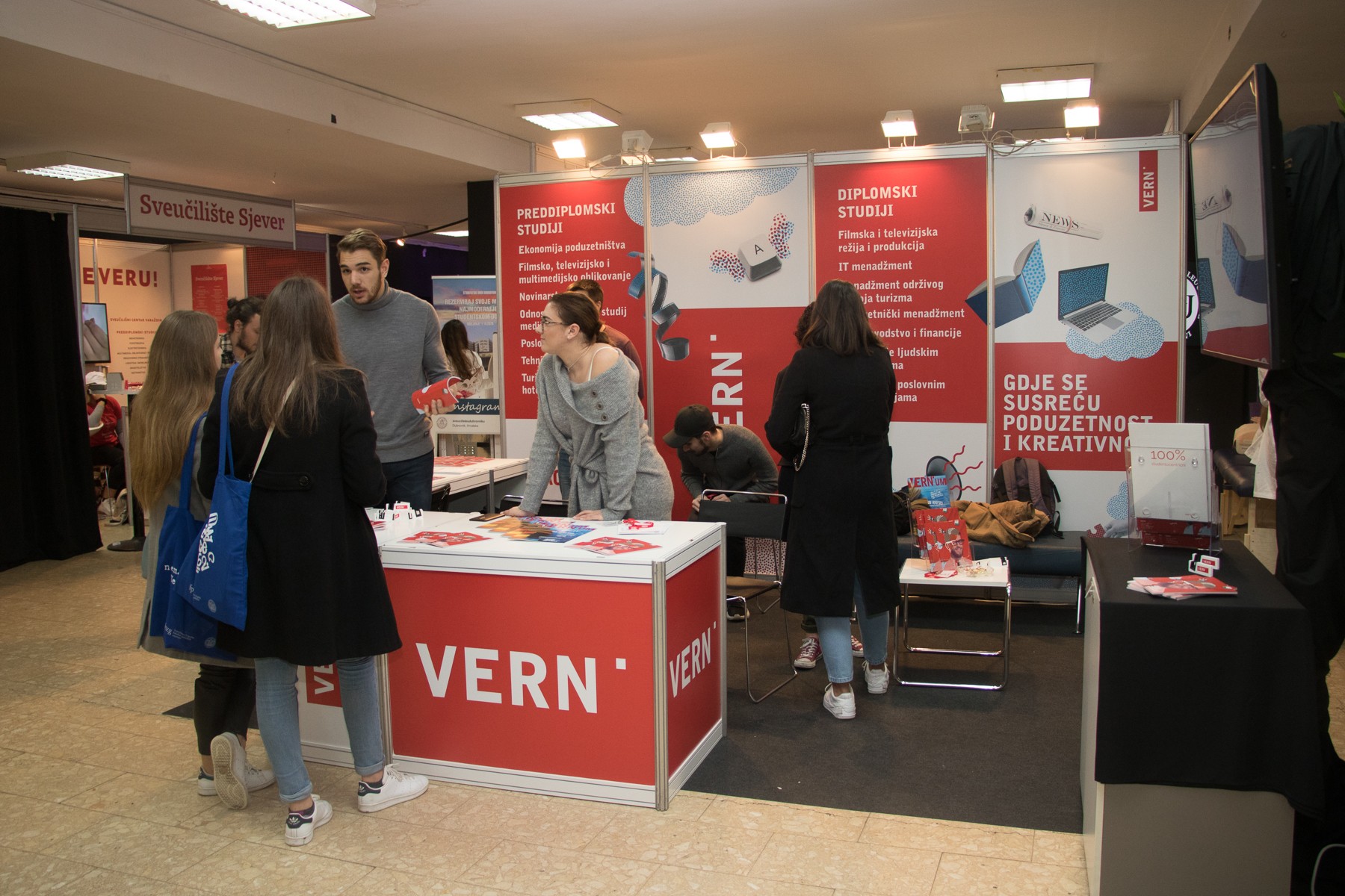 Posjetitelji Smotre, mahom maturanti i budući studenti, u VERN’ovom su se izložbenom prostoru družili s našim studentima od kojih su saznali sve informacije o preddiplomskim i diplomskim studijima, mogućnostima upisa, nastavnim i izvannastavnim aktivnostima, studentskom životu na VERN’u, našoj Udruzi studenata, kao i kulturnim i sportskim aktivnostima za studente.