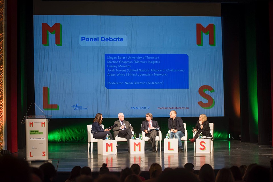 In addition to leading the entire conference program, our lecturer also moderated a round table discussion on the topic of "fake news as a threat to democracy", which was discussed by international experts: Professor Megan Boler from the University of Toronto, Martina Chapman , founder of the British consulting company Mercury Insights, Evgeny Morozov and Jordi Torrent from the United Nations Alliance of Civilizations initiative and Aidan White from the Ethical Journalism Network.