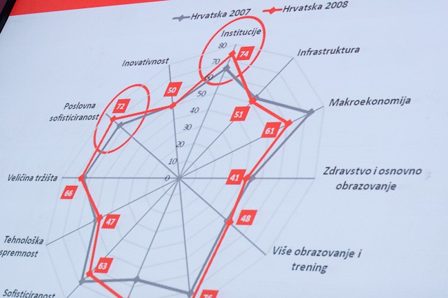 Porter je pohvalio Hrvatsku jer je u kratkom vremenu nakon rata i opterećena poviješću doista napredovala i postigla solidan gospodarski rast. No, dodao je kako Hrvatska za sada nije globalno konkurentna, osim možda u turizmu i uslugama te telekomunikacijama (mobilna telefonija).