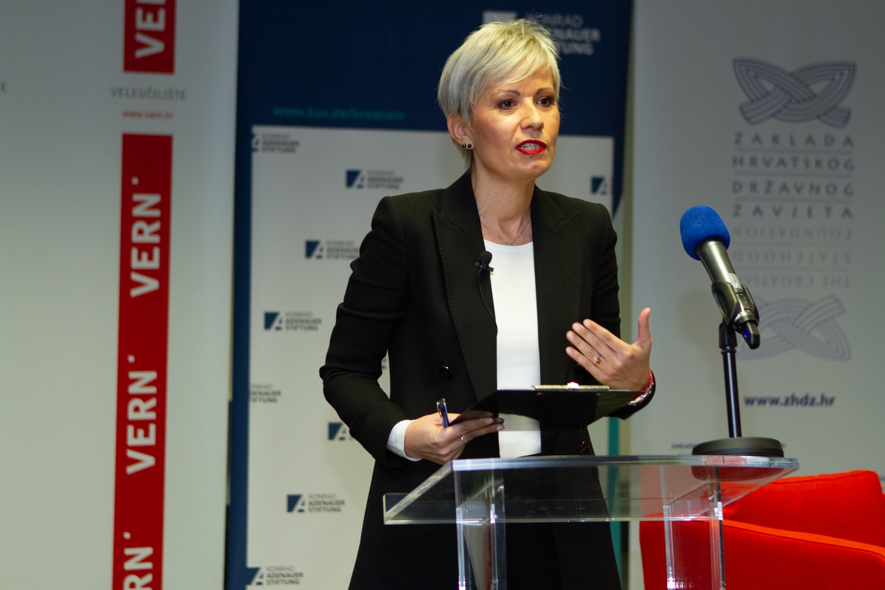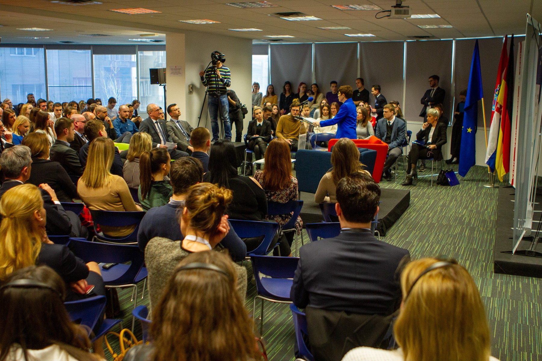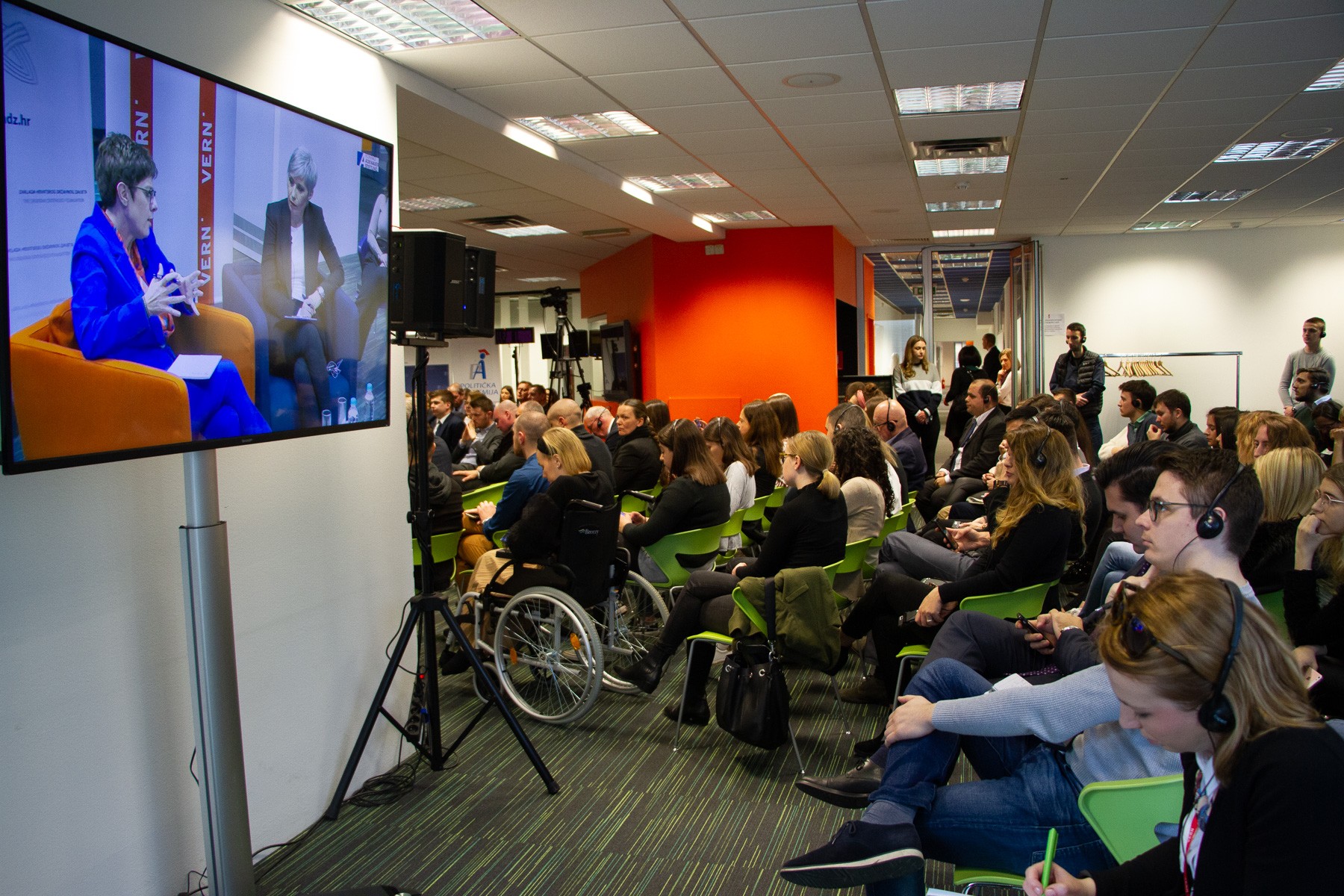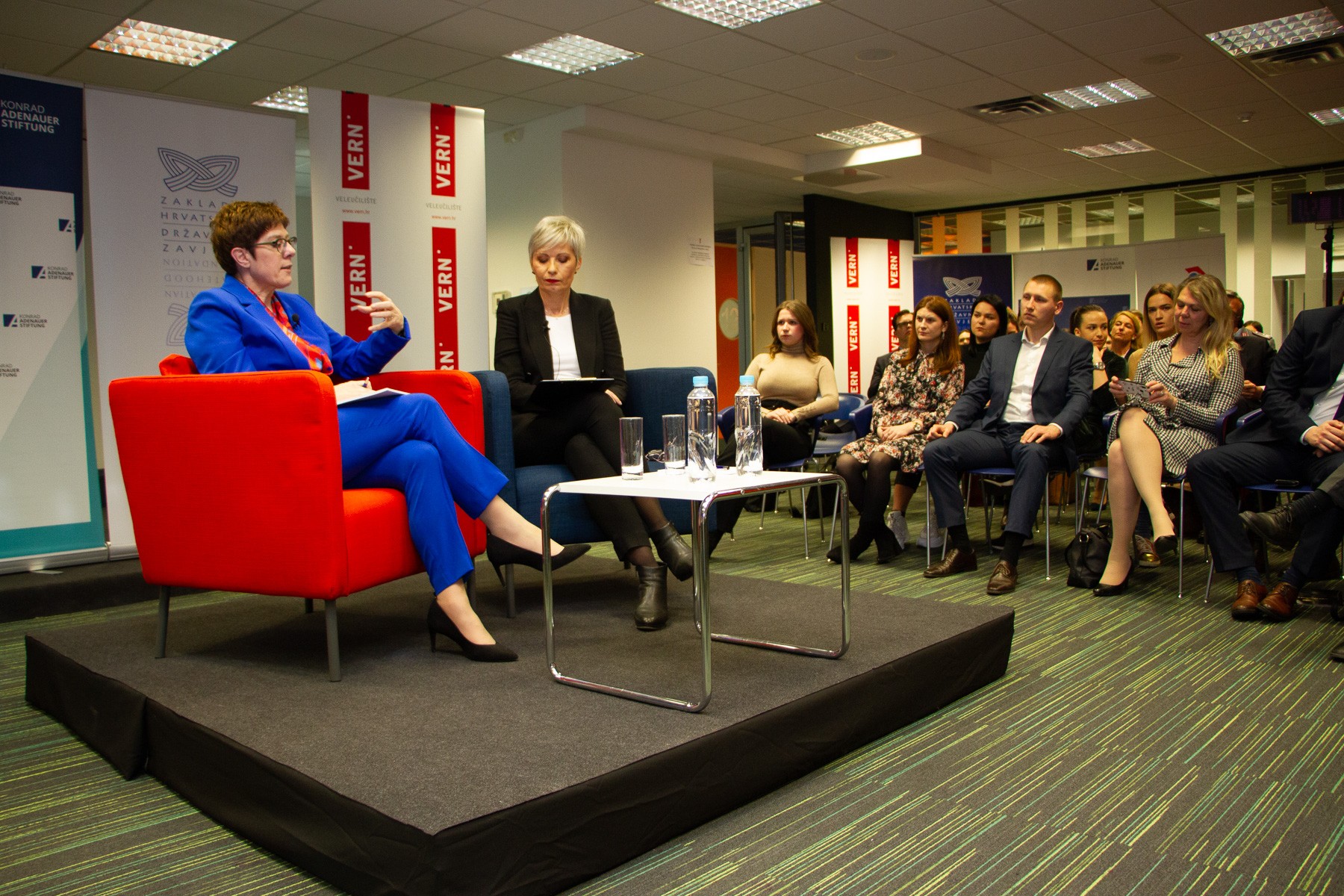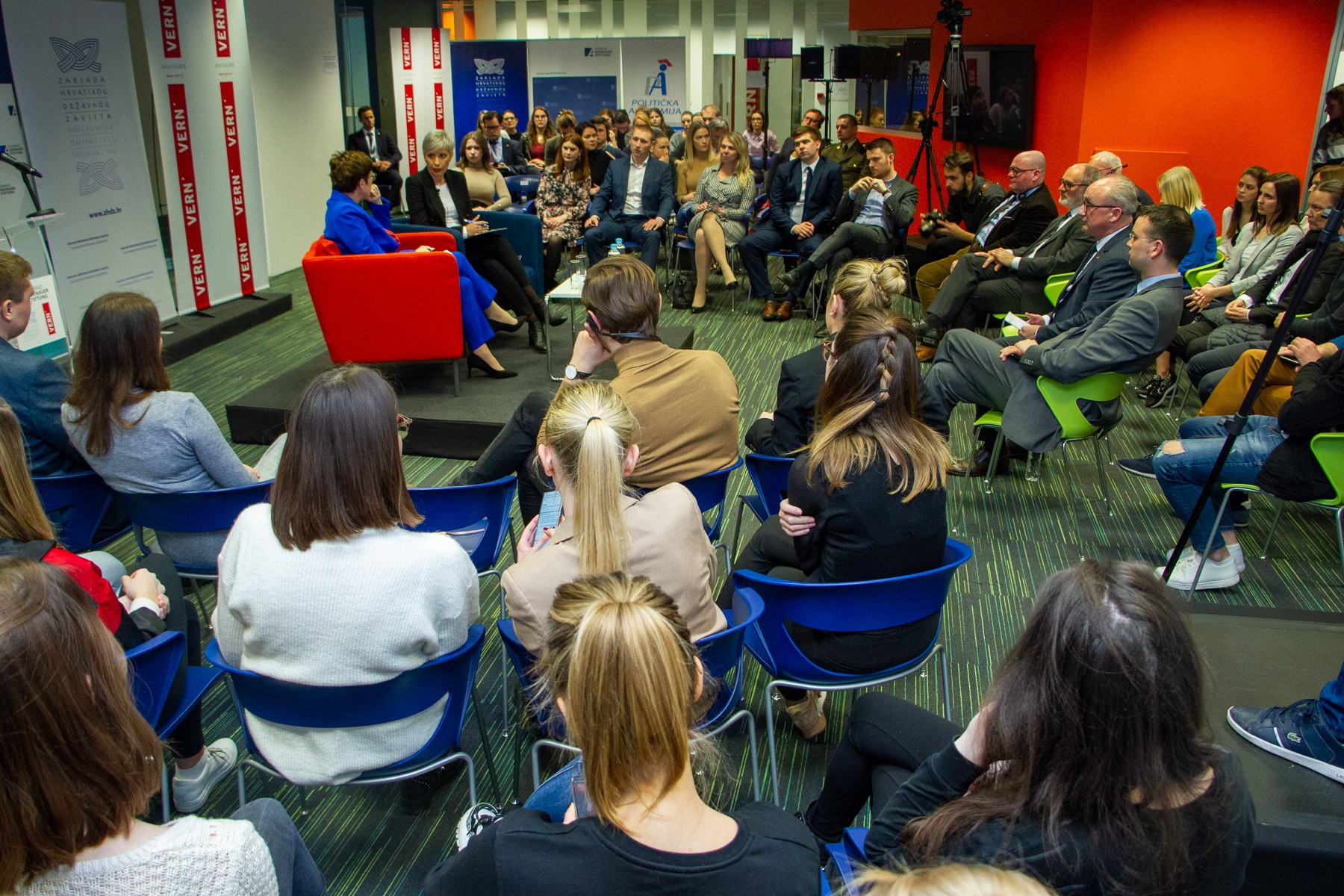 Nakon uvodnog izlaganja, u diskusiji koju je moderirala cijenjena novinarka i predavačica na VERN’u Morana Kasapović, ministrica je odgovarala na pitanja studenata i mladih koje je između ostalog zanimalo kako će se razvijati migracijska kriza u Europi, kakva će biti suradnja zajedničke europske vojske i NATO-a, kakva će biti granična nadležnost europske vojske, jesu li migracije veća prijetnja stabilnosti Europe od negativnih demografskih trendova te mogu li obnovljivi izvori energije i čist okoliš postati strateške europske snage.