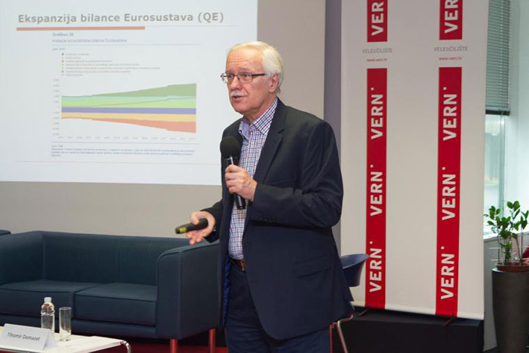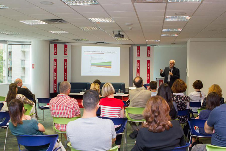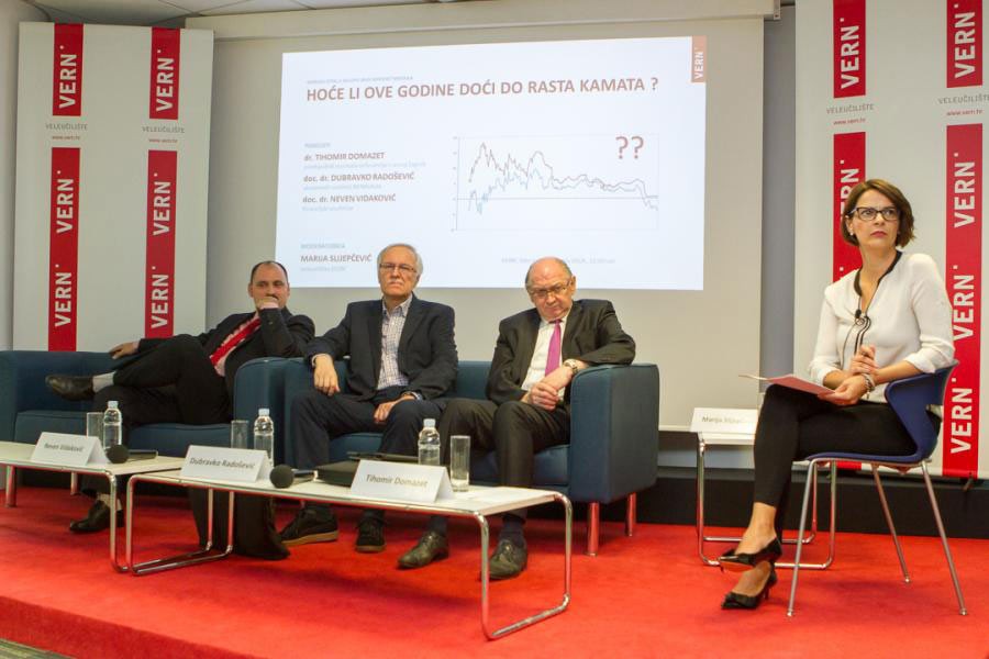 Hoće li ove godine doći do rasta kamata, pod utjecajem inozemnih kretanja? Pitanje je to kojim se bave brojni domaći, ali i svjetski analitičari i ekonomisti, budući da Europska centralna banka (ECB) već dulje vrijeme kamatne stope drži na povijesno niskim razinama. Koliko je takvo stanje održivo, hoće li se ECB morati prilagođavati poreznoj politici SAD-a, gdje kamatne stope rastu te u konačnici, kako će se moguće intervencije ECB-a odraziti na gospodarstvo i život u Hrvatskoj, na Sveučilištu VERN’ su danas analizirali dr. Tihomir Domazet, predsjednik Instituta za financije i razvoj Zagreb, doc. dr. Dubravko Radošević, akademski voditelj Jean Monnet Modula na VERN’u i financijski analitičar doc. dr. Neven Vidaković.