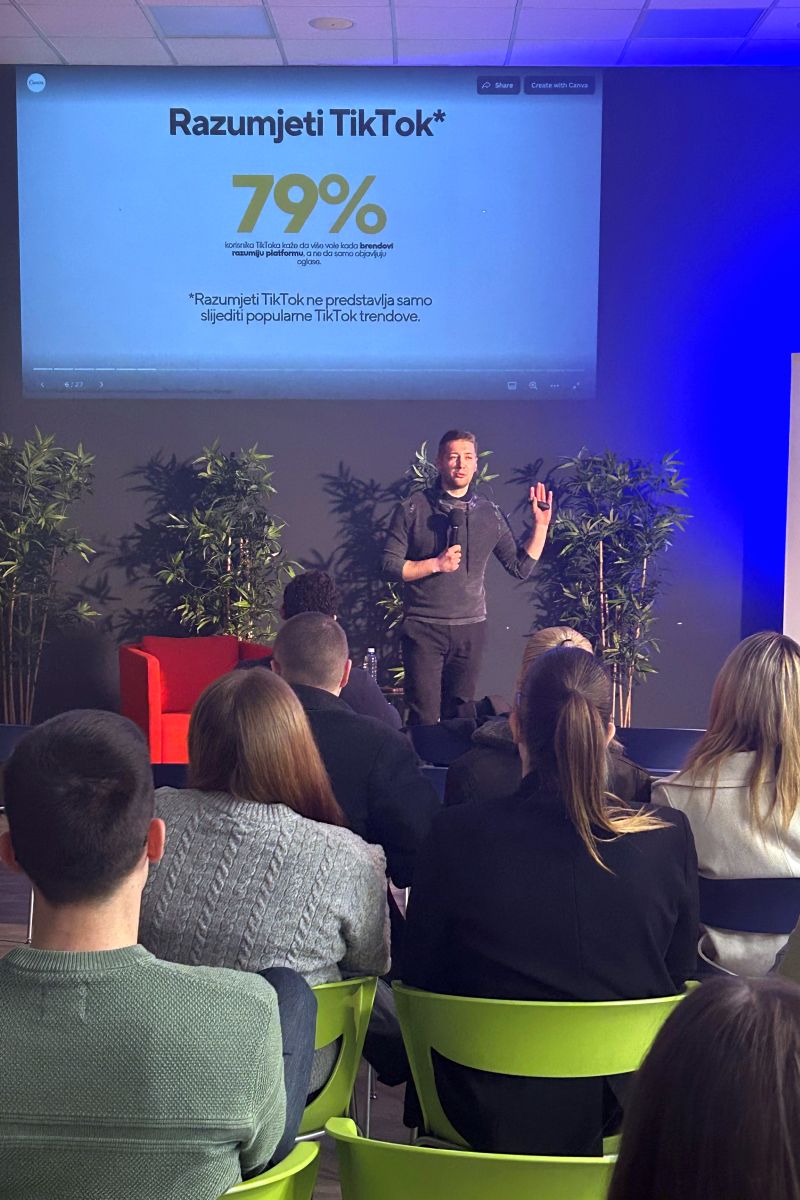Na TikTok masterclassu pod nazivom „Od ideje do viralnog videa“ koji je održan na VERN’u Dario je studentima pojasnio da čak 79 posto korisnika ove društvene mreže više voli kada brendovi razumiju platformu, umjesto da samo objavljuju oglase.