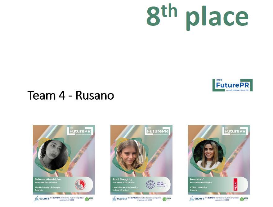 VERN’ova studentica diplomskog studija Upravljanje poslovnim komunikacijama, Nina Vresnik zauzela je treće mjesto na globalnom studentskom natjecanja EUPRERA FuturePR 2025, na koje se plasirala sa svojim timom „VOV“ u kojem su bile i dvije studentice iz Ujedinjenog Kraljevstva i Španjolske.