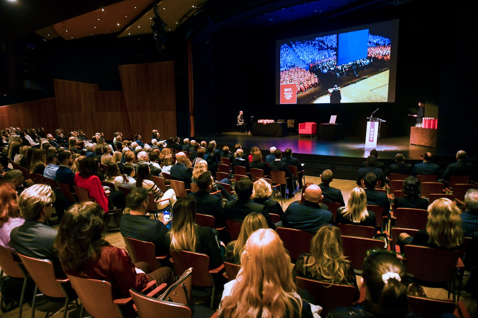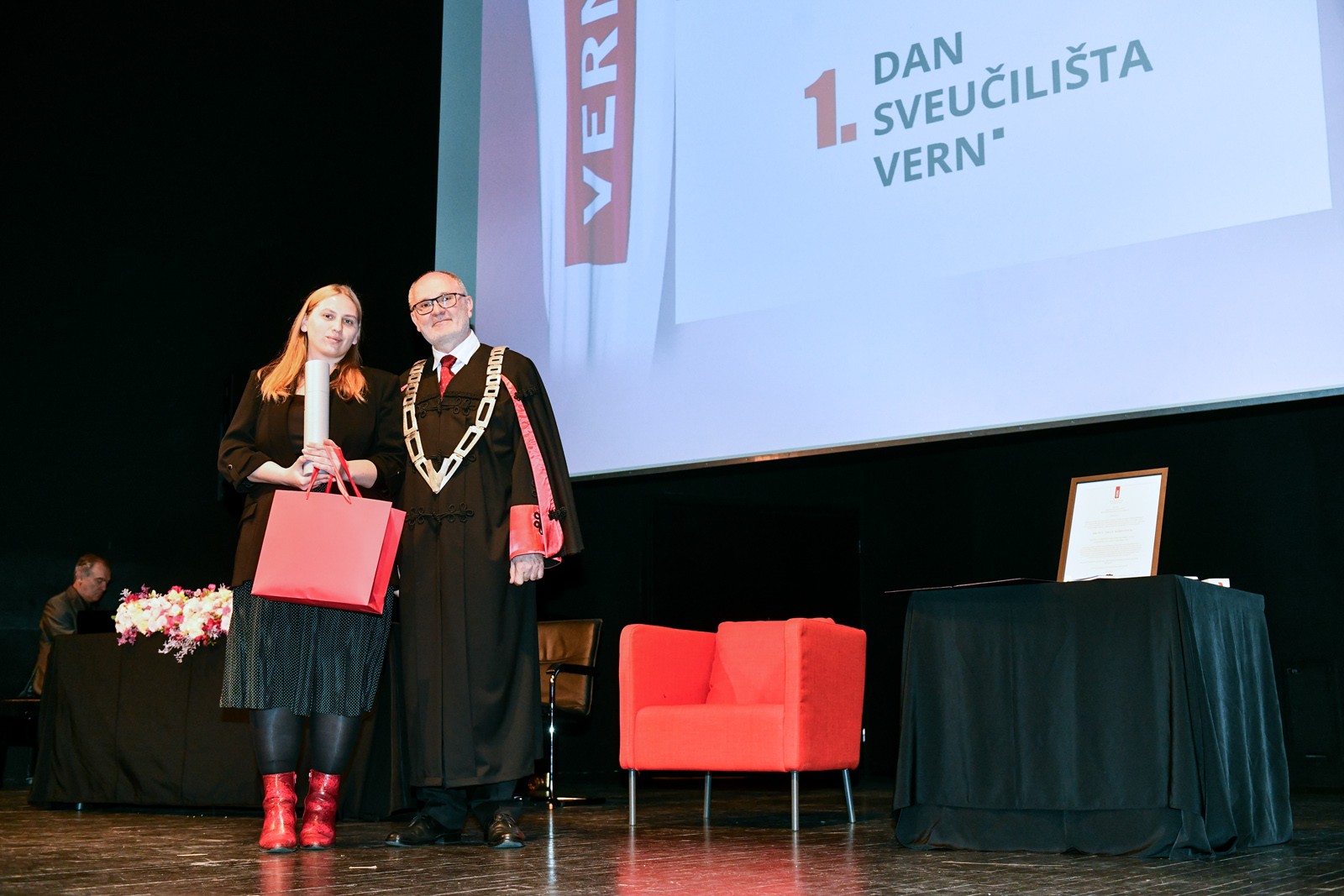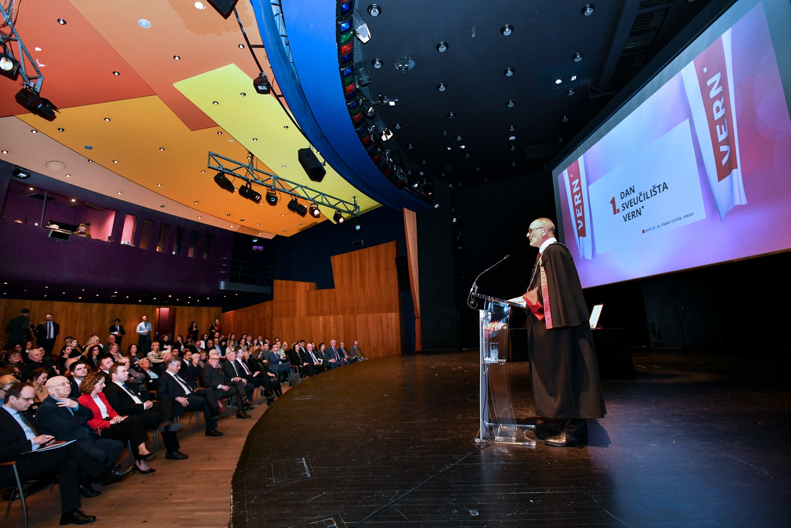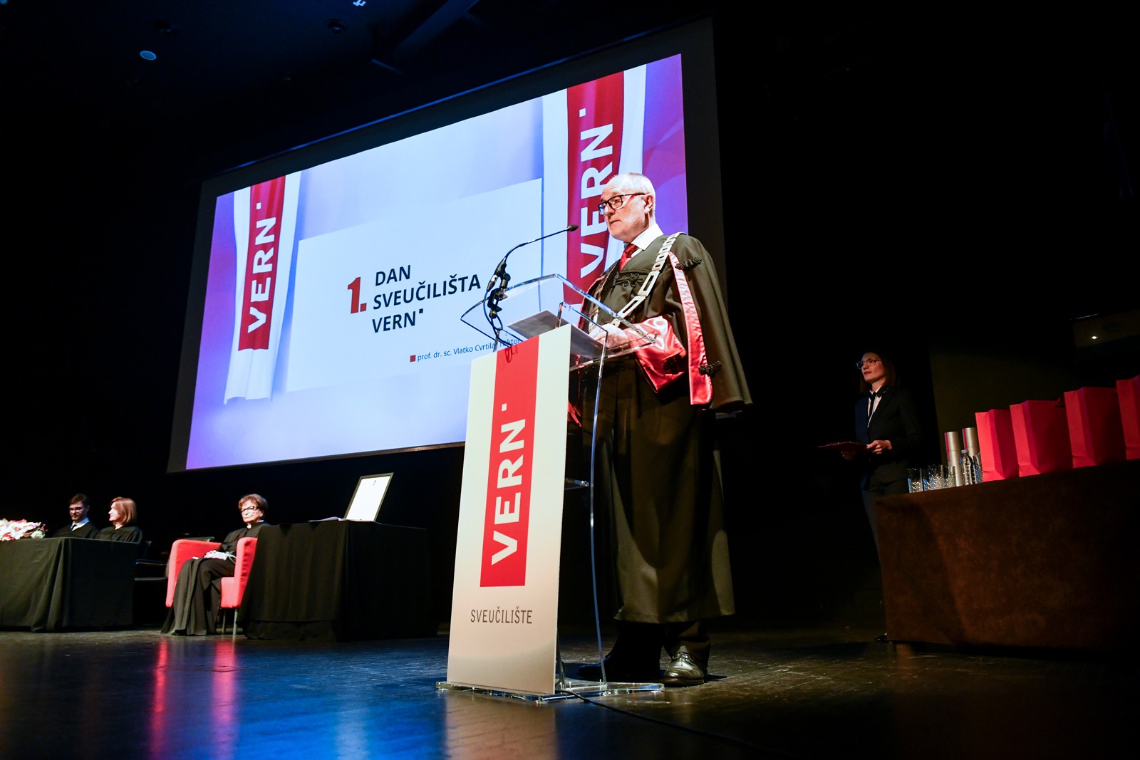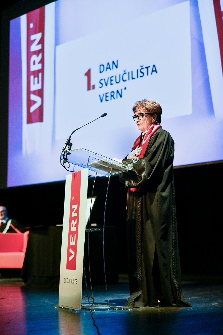 U svečanom ambijentu Koncertne dvorane Vatroslav Lisinski, u Maloj dvorani održan je prvi Dan Sveučilišta VERN’, a tim povodom dodijeljen je i prvi počasni doktorat gospođi dr. h. c. mult. Doris Pack te prve rektorove nagrade za studente.
