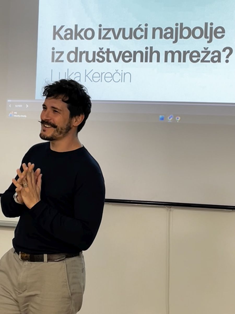 Kao jedan od ključnih ljudi za digitalnu komunikaciju platforme MOŽEMO! te dugogodišnji akter u kampanjama progresivnih političkih inicijativa, Kerečin je studentima približio upotrebu društvenih mreža kao snažnog alata civilnog i političkog aktivizma. Na početku izlaganja kratko je predstavio svoj karijerni put – od angažmana u IT i glazbenoj industriji (uspjeh s grupom LET3) do rada na političkim kampanjama. Posebno je naglasio važnost razumijevanja ciljanih javnosti te jasnog određivanja ciljeva prije odabira kanala i formata sadržaja. Kroz primjere je pokazao kako autentična komunikacija, dosljedan vizualni identitet i pametno vođenje profila na društvenim mrežama mogu izgraditi povjerenje i angažman zajednice.