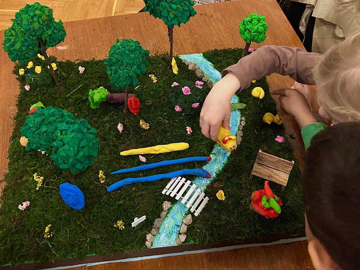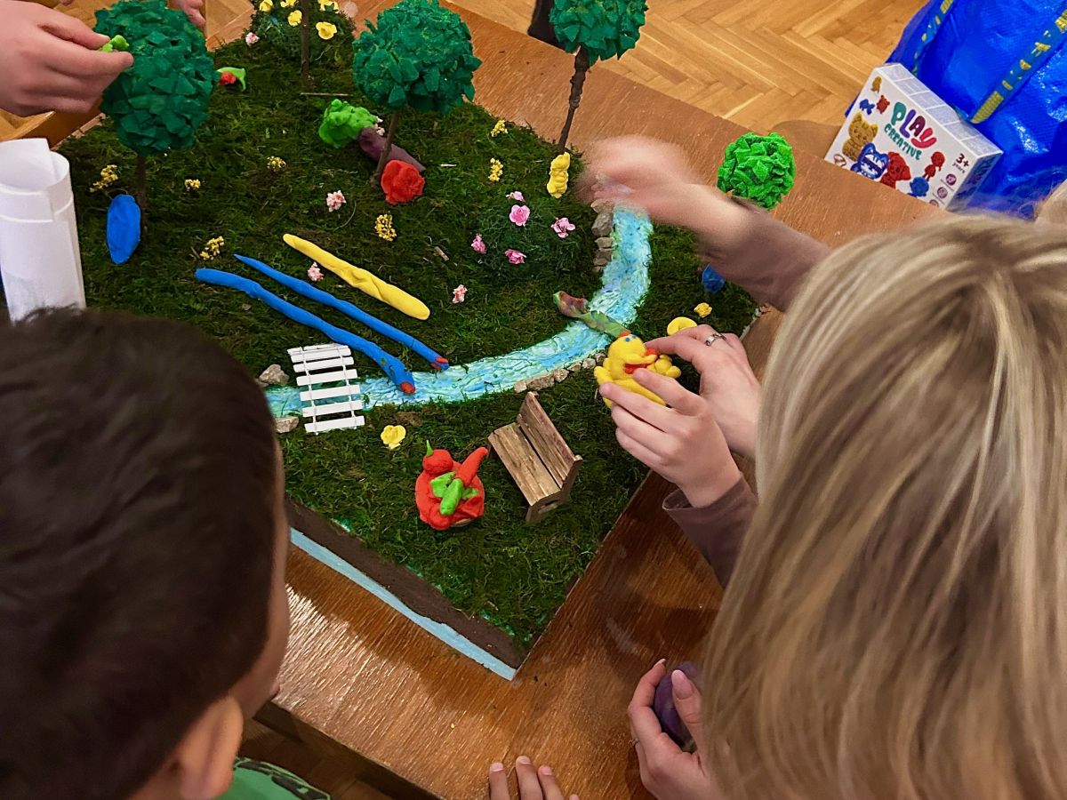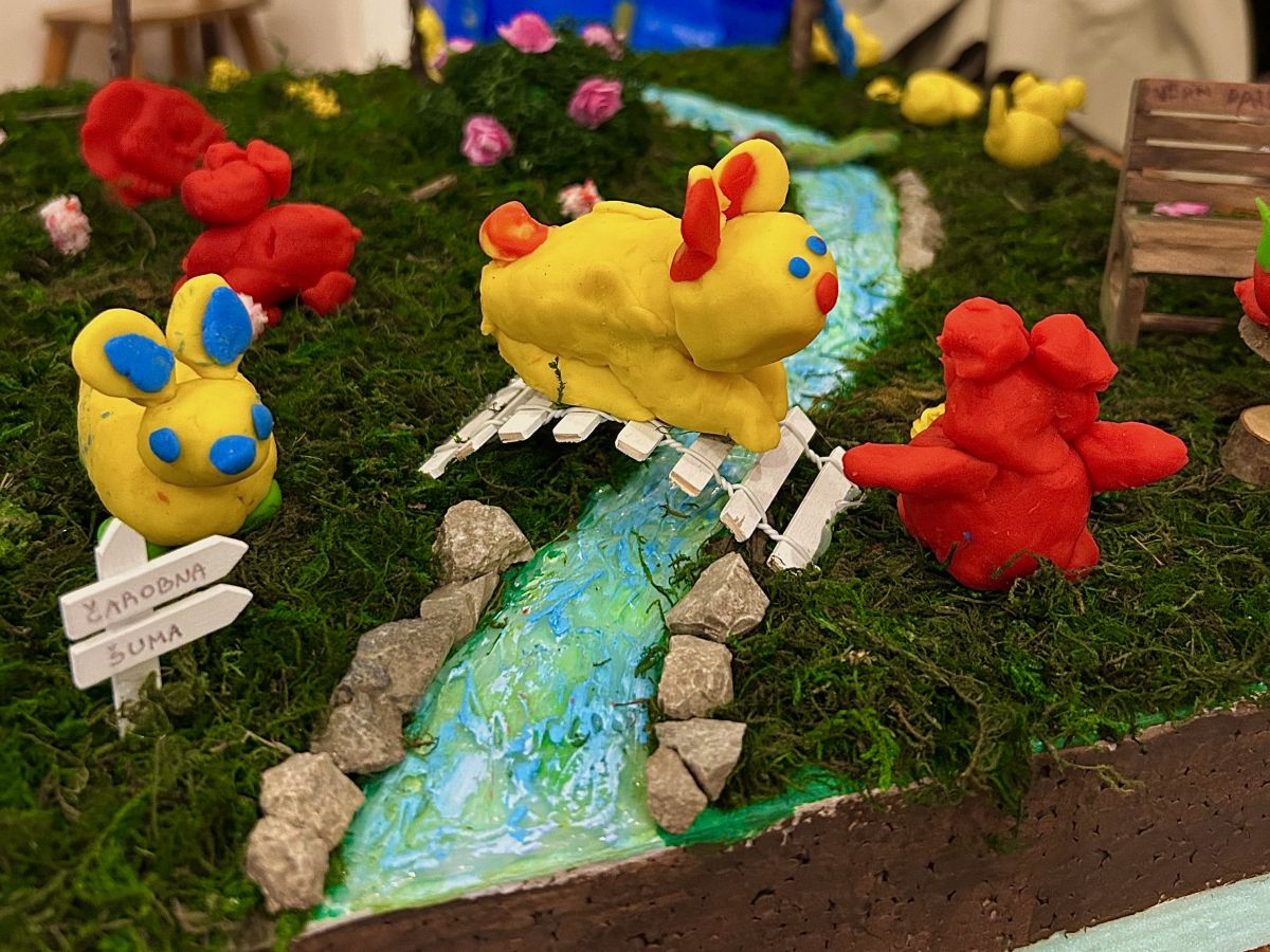 Naše su studentice unaprijed izradile maketu šume, a djeca su plastelinom oblikovala svoje životinje — od medvjedića i zečeva do potpuno maštovitih bića — i pažljivo ih smještala u šumu „čarobnu šumu“. Tijekom radionice izmjenjivali su se trenuci koncentracije, uzbuđenja i ponosa dok su nastajali mali detalji i cijeli svjetovi.