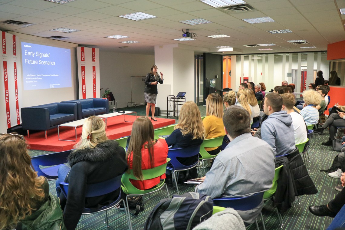 Razvoj tehnologije, umrežavanje, tehnološka sučelja i utjecaj tehnologija na poslovne modele, ali i živote običnih ljudi, bile su glavne teme gostujućeg predavanja Leslie Shannon iz Nokije koje je jučer održano u organizaciji NOKIA-e i Sveučilišta VERN’.