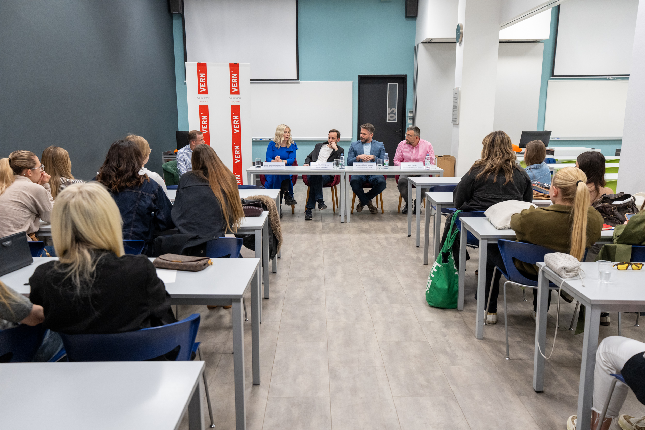 U okviru nastave za VERN’ove studente drugih godina prijediplomskih studija Odnosi s javnošću i Novinarstvo održana je panel diskusija na kojoj su korisne savjete i dragocjeno dugogodišnje iskustvo studentima podijelili cijenjeni stručnjaci iz medijske i komunikacijske industrije te europske diplomacije.