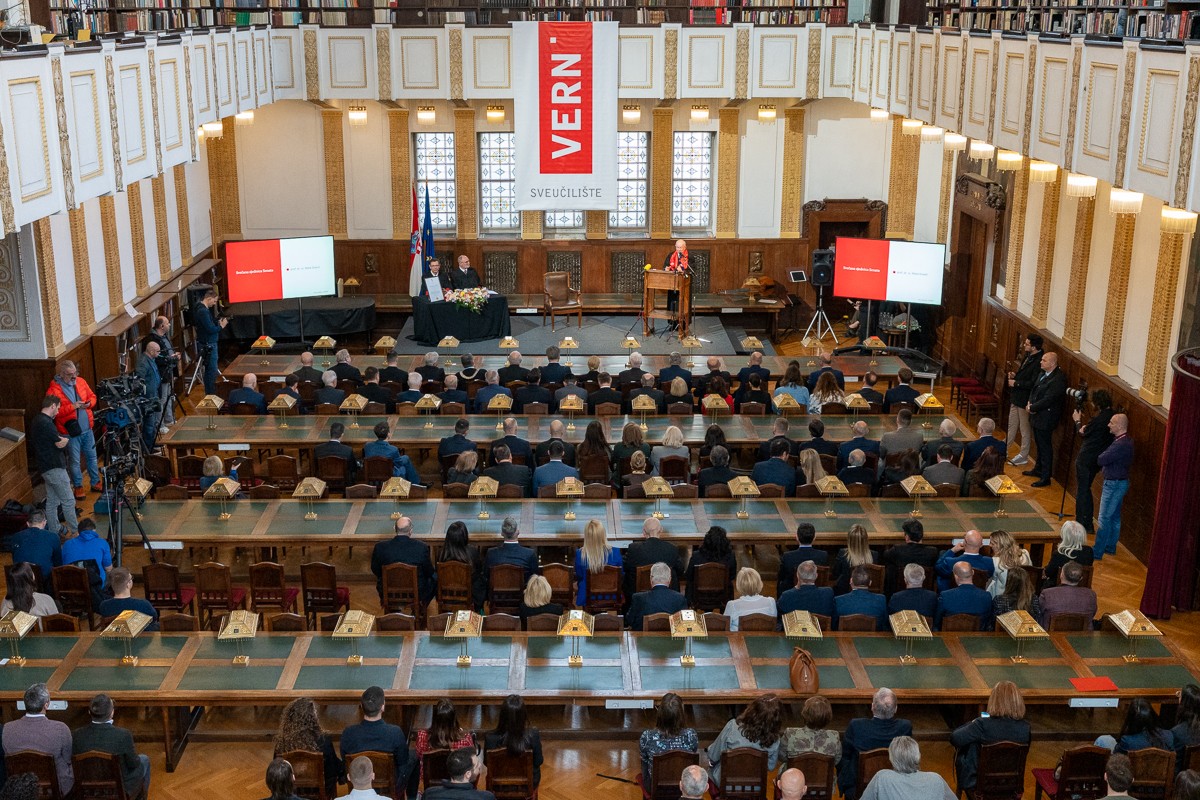 Sudionike svečane sjednice ovom je prigodom pozdravio i novi rektor Sveučilišta VERN’, prof. dr. sc. Vedran Mornar koji je istaknuo značaj ovog događaja za budućnost institucije, ali i ukazao na buduće izazove za hrvatsko društvo.