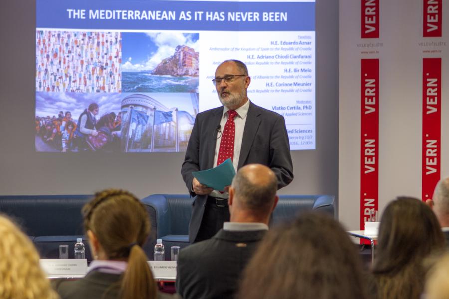 S dekanom VERN’a i cijenjenim stručnjakom za geopolitiku, prof. dr. sc. Vlatkom Cvrtilom veleposlanici su analizirali izazove koji stoje pred zemljama Mediterana, iz perspektive migracijskih trendova te njihovog manifestiranja na mediteranski mentalitet, sigurnosnu politiku, implementaciju političke agende EU te gospodarstvo i demografiju.