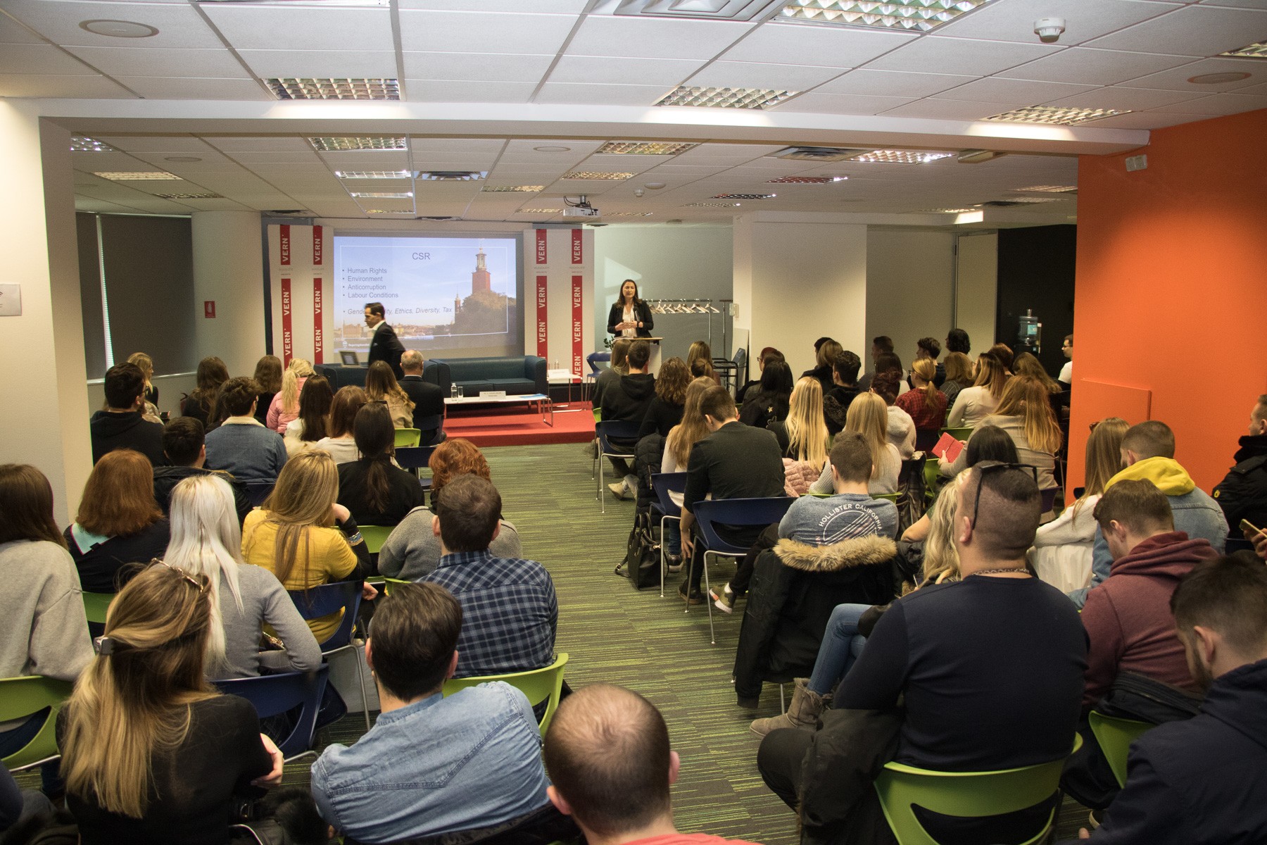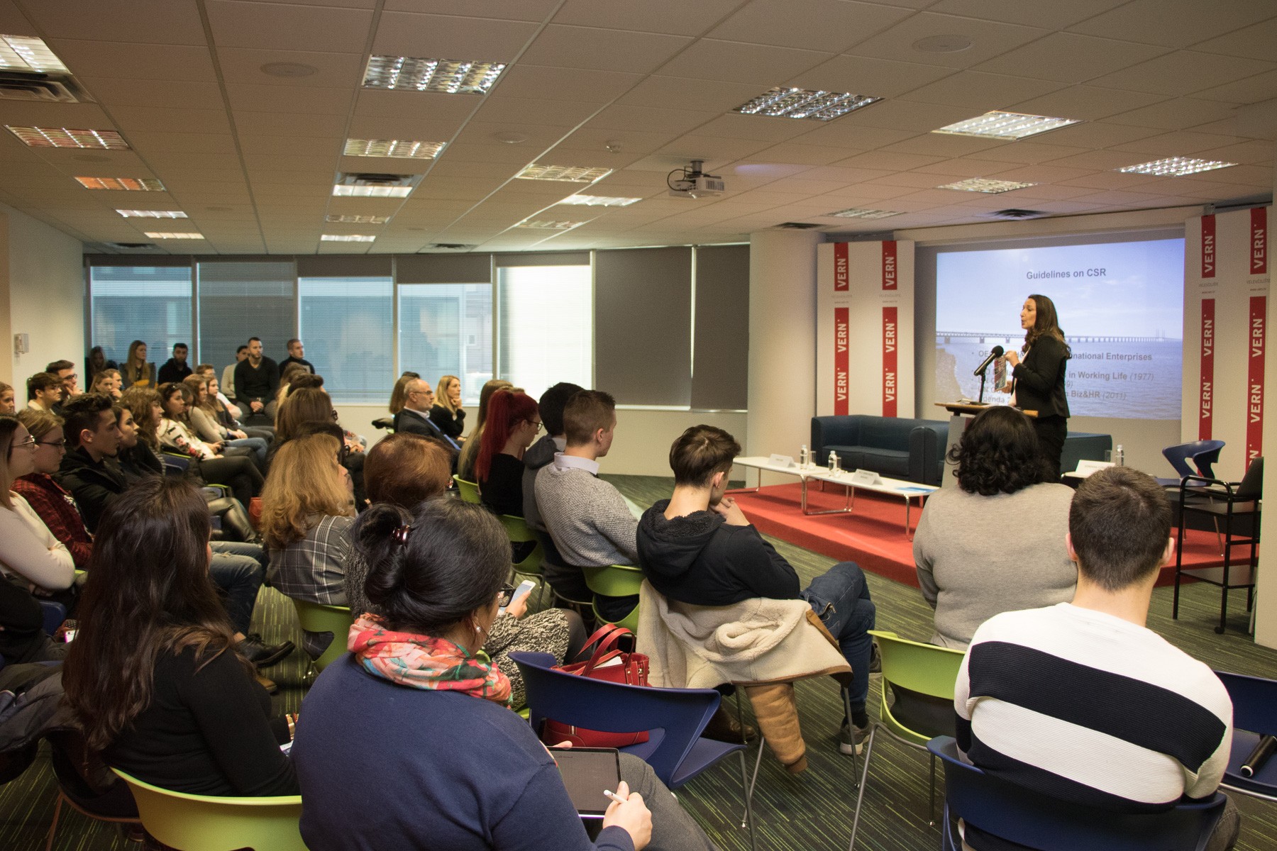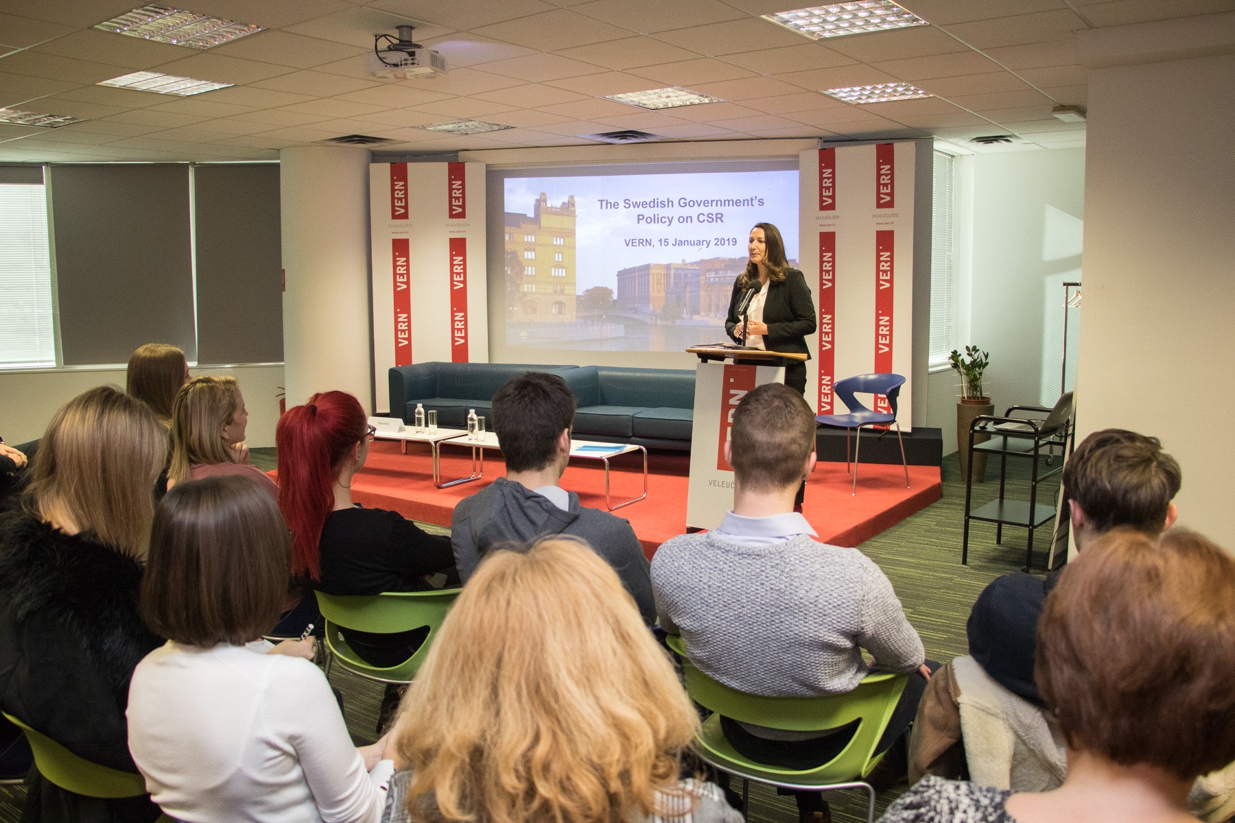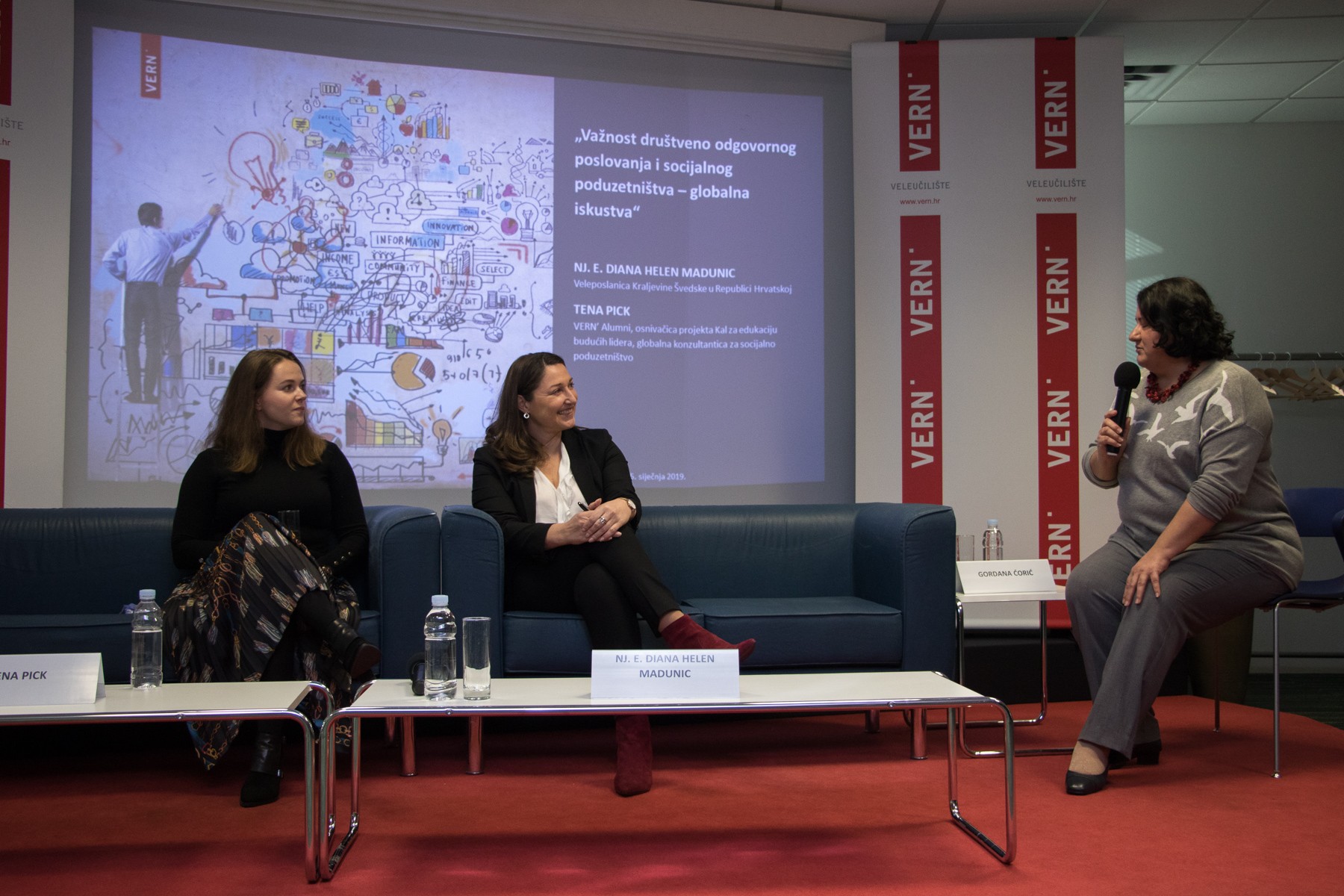 Zaključeno je to danas na VERN’u na gostujućem predavanju NJ. E. Diane Helen Madunic, veleposlanice Kraljevine Švedske u Republici Hrvatskoj i VERN’ove diplomantice Tene Pick, koje su na temu „Važnost društveno odgovornog poslovanja i socijalnog poduzetništva – globalna iskustva“, upoznale studente s primjenom društveno odgovornog poslovanja u Švedskoj i tamošnjim kompanijama, od kojih mnoge posluju i u Hrvatskoj te poticanjem ženskog poduzetništva kroz društvene projekte u Dubaiju i Indiji.