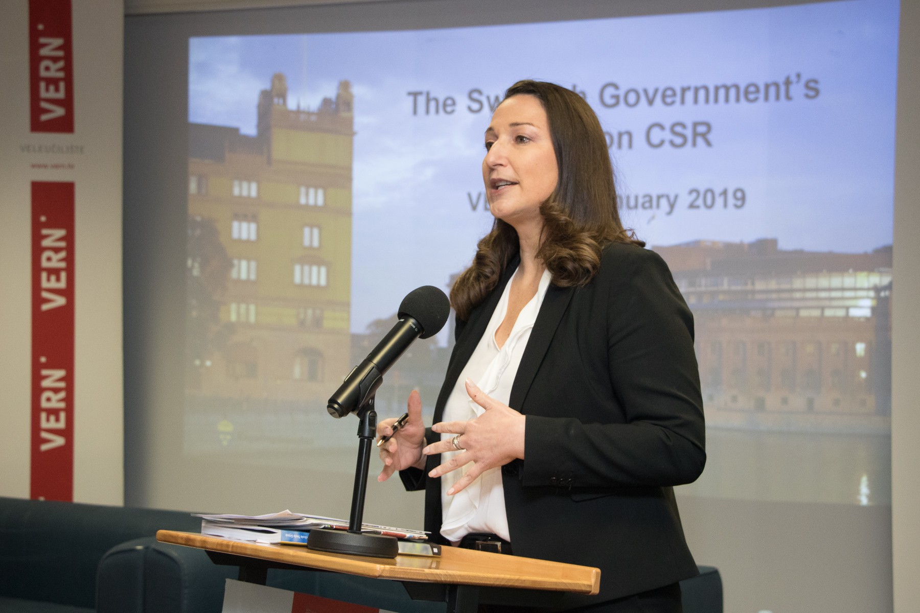 „Prema EU direktivi sve tvrtke koje zapošljavaju više od 500 djelatnika moraju podnositi izvješća o aspektima društveno odgovornog poslovanja, dok smo u Švedskoj taj uvjet postavili za sve poslovne organizacije s više od 250 zaposlenika. Prošle godine izvješća je podnijelo više od 1.600 švedskih tvrtki“, istaknula je veleposlanica te ilustrirala na koji način društveno odgovorno poslovanje integriraju Scania, IKEA te H&M.