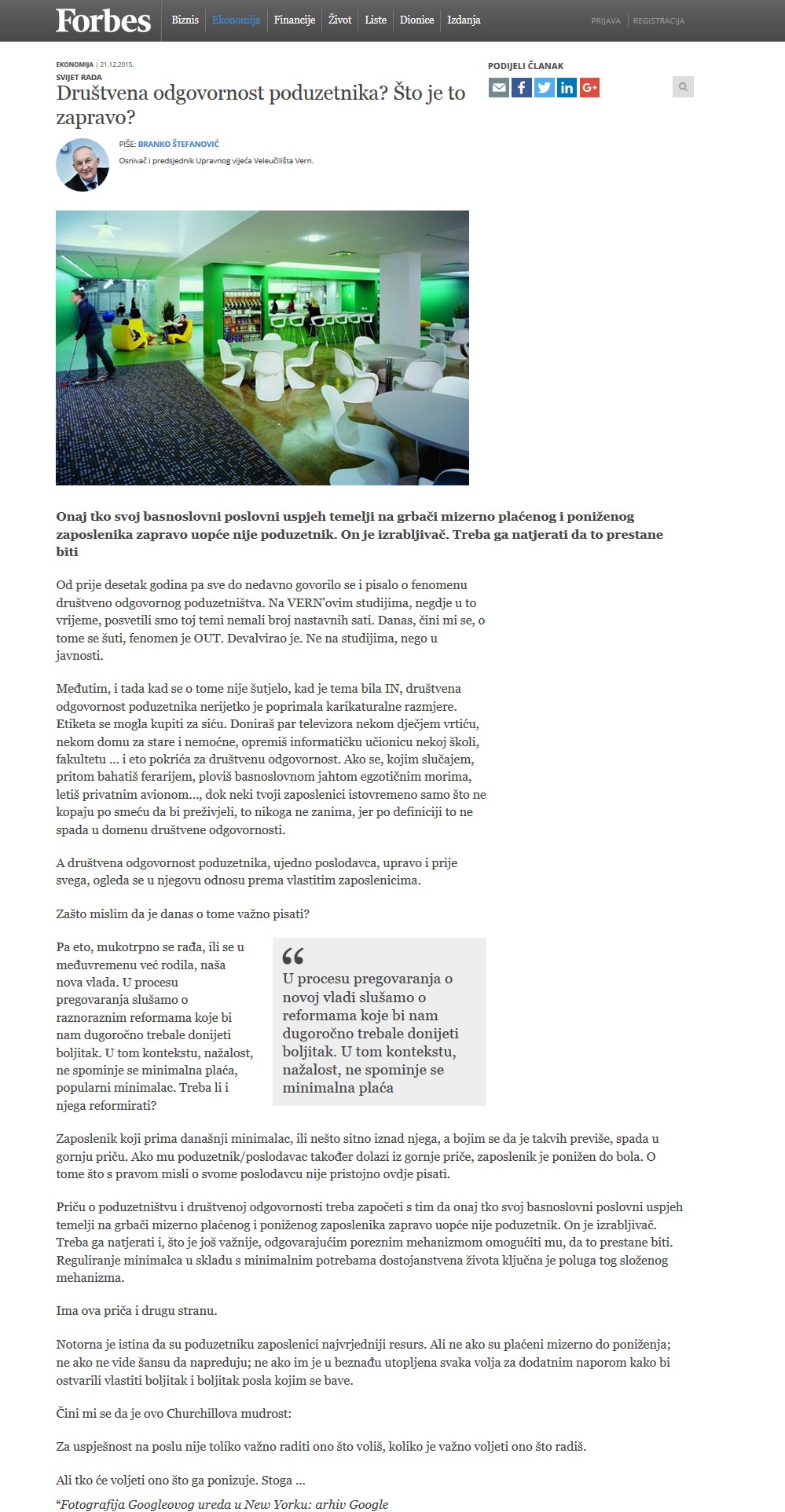 U novoj kolumni na internetskoj stranici hrvatskog izdanja poslovnog magazina Forbes, predsjednik Upravnog vijeća VERN’a, Branko Štefanović, zapaža da je fenomen „društvene odgovornosti poduzetnika“, u javnosti izgubio na vrijednosti.