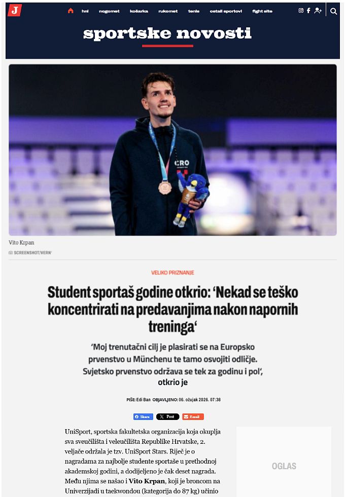 Najuglednije sportske dnevne novine u Hrvatskoj, Sportske novosti objavile su intervju s VERN’ovim studentom Vitom Krpanom, ovogodišnjim dobitnikom nagrade za „sportaša godine“ u izboru Hrvatskog akademskog sportskog zaveza (HASS).