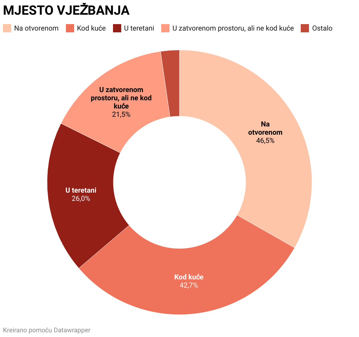 Među ukupno 503 ispitanika koji se bave tjelovježbom, najzastupljenije je vježbanje na otvorenom što znači da se bave trčanjem, planinarenjem ili nekom sličnom aktivnošću (46,5%), a zatim slijedi vježbanje kod kuće (42,7%), zatim vježbanje u teretani (26%) te u nekom drugom zatvorenom prostoru (21,5%) poput studija za jogu i pilates ili bazena.