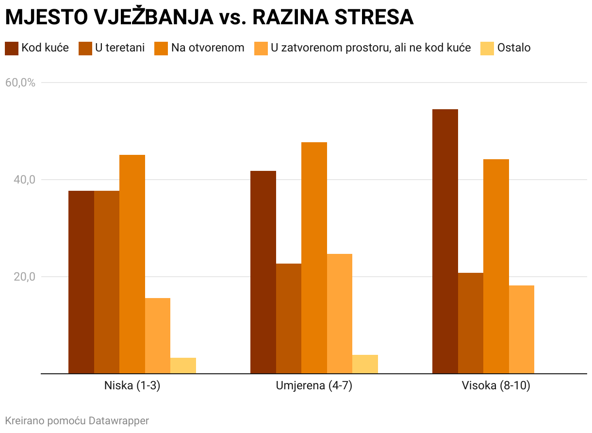 Vježbanje kod kuće u najvećoj mjeri prakticiraju oni ispitanici koji za sebe procjenjuju da su pod visokom razinom stresa, dok vježbanje na otvorenom u najvećoj mjeri prakticiraju ispitanici pod umjerenom razinom stresa, a vježbanje u teretani i/ili kod kuće oni pod niskom razinom stresa.