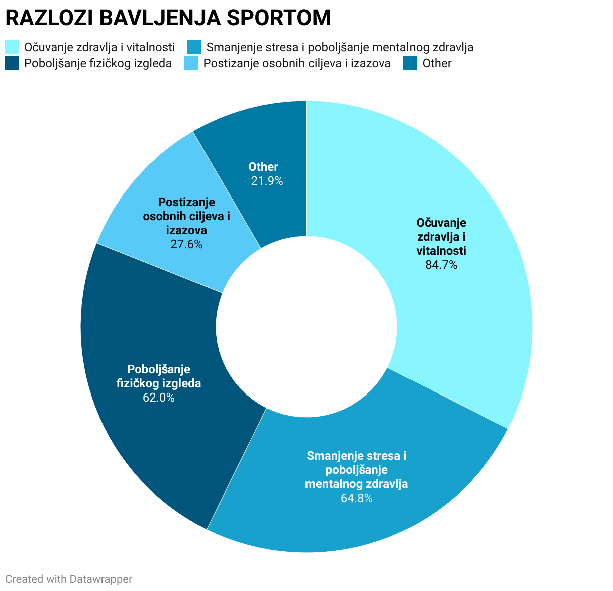 Među ispitanicima koji se bave tjelovježbom, najvažniji razlog bavljenja sportom je očuvanje zdravlja i vitalnosti (za 84,7% ispitanika), dok je na drugom mjestu smanjenje stresa i poboljšanje mentalnog zdravlja (za 64,8% ispitanika), a na trećem mjestu poboljšanje fizičkog izgleda (za 62% ispitanika).