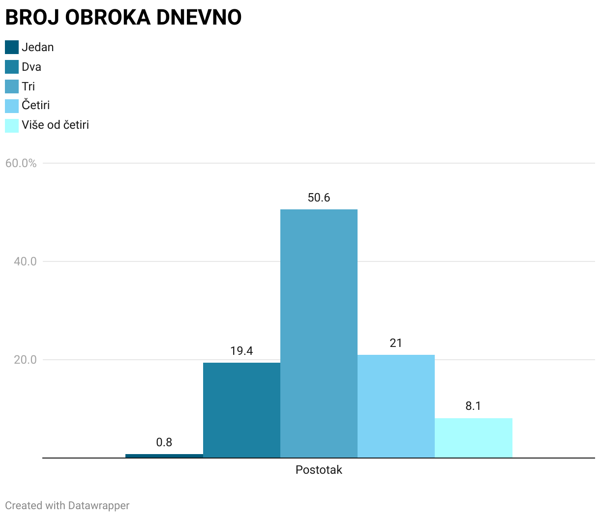 Od ukupnog broja 828 ispitanika najveći dio njih (50,6%) konzumira tradicionalna tri obroka dnevno, dok ih četiri obroka dnevno konzumira 21%, a nutricionistički optimalniju varijantu s više od četiri obroka dnevno konzumira tek 8,1% ispitanika.
