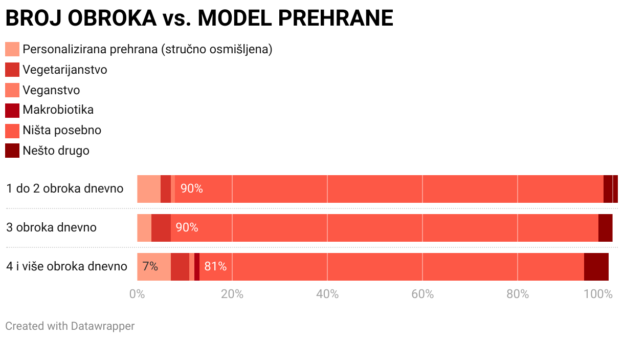 Bez obzira koliko obroka dnevno konzumiraju velika većina ispitanika je odgovorila da ne prakticiraju neki poseban model prehrane, a zanimljivo je za primijetiti da najveći udio ispitanika koji konzumiraju četiri i više obroka dnevno ima personaliziranu (stručno osmišljenu) prehranu.