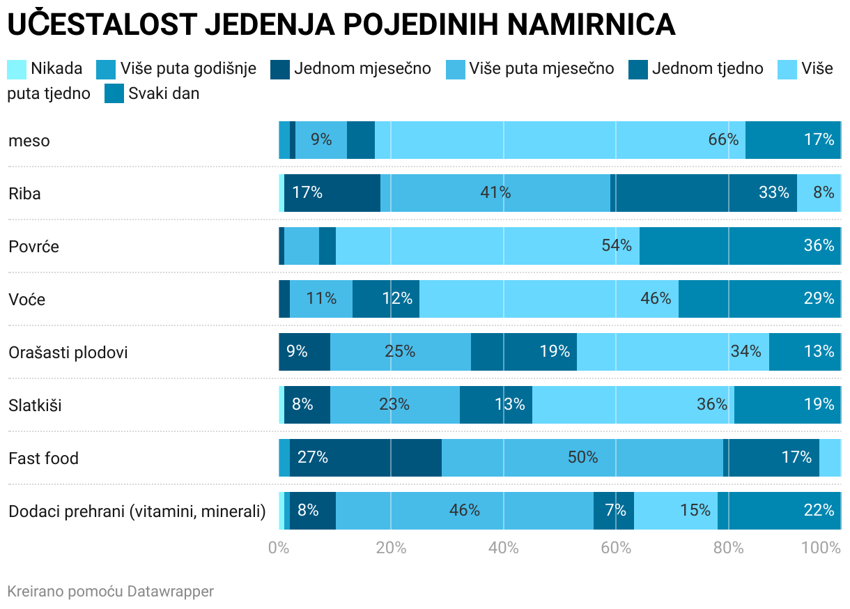 U pogledu učestalosti konzumacije pojedinih namirnica u najvećoj mjeri se konzumiraju meso, povrće i voće. Tako je 66% ispitanika navelo da meso konzumiraju više puta tjedno, a 17% ga konzumira svakodnevno. Povrće više puta tjedno konzumira 54%, a svakodnevno 36% ispitanika, dok ih voće više puta tjedno konzumira 46%, a 29% ih jede voće svakodnevno.