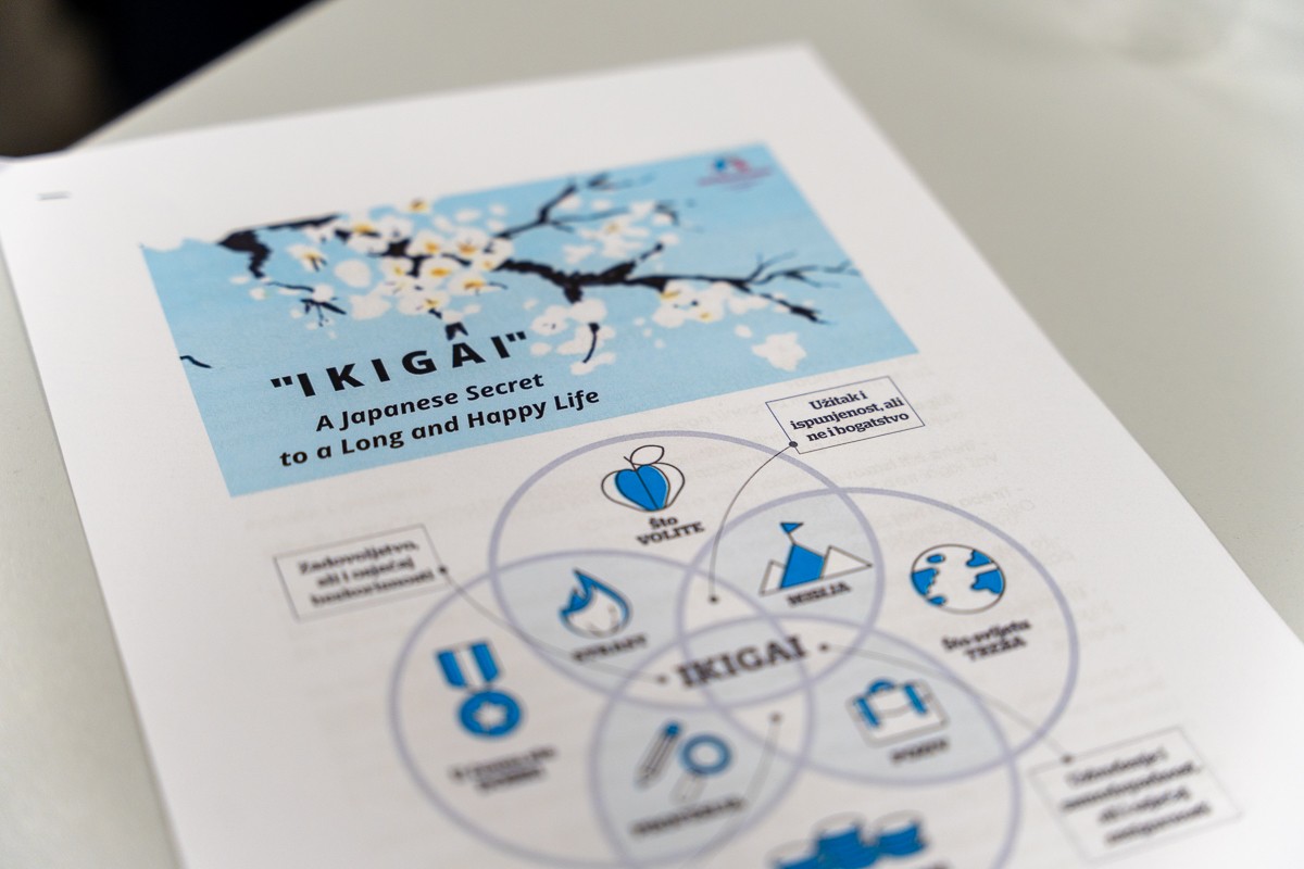 Studente je vodila kroz pitanja i korake o osvještavanju stvari koje vole (naša strast), stvari koje su svijetu potrebne (naša misija), stvari u kojima su dobri (naš poziv) i stvari za koje mogu biti plaćeni (naša profesija). Najinteresantnije, Ikigai se nalazi upravo u sjecištu tih četiriju elemenata, a gošća je potaknula studente da promisle o svojim vrijednostima, što im nikada ne dosadi raditi, kada su najsretniji, koje prirodne vještine, snage ili talente posjeduju, da naprave popis svojih potencijalnih prihoda i da promisle što mogu učiniti ili ponuditi, a da i drugima daje smisao.