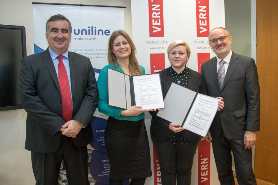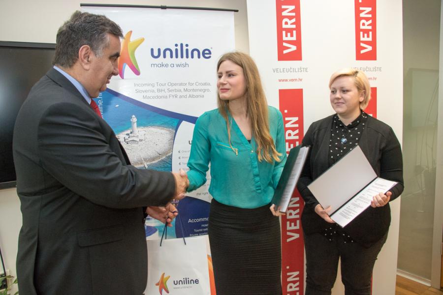 Nakon što su u prosincu osvojile stipendije Unilinea u okviru natječaja „Program poticanja obrazovanja kadrova u ugostiteljstvu i turizmu u 2017. godini“, kojeg provodi Ministarstvo turizma Republike Hrvatske, studenticama Veleučilišta VERN’, Ivoni Kulaš i Ani Šokman su u prostorima VERN’a uručeni ugovori o stipendiranju.