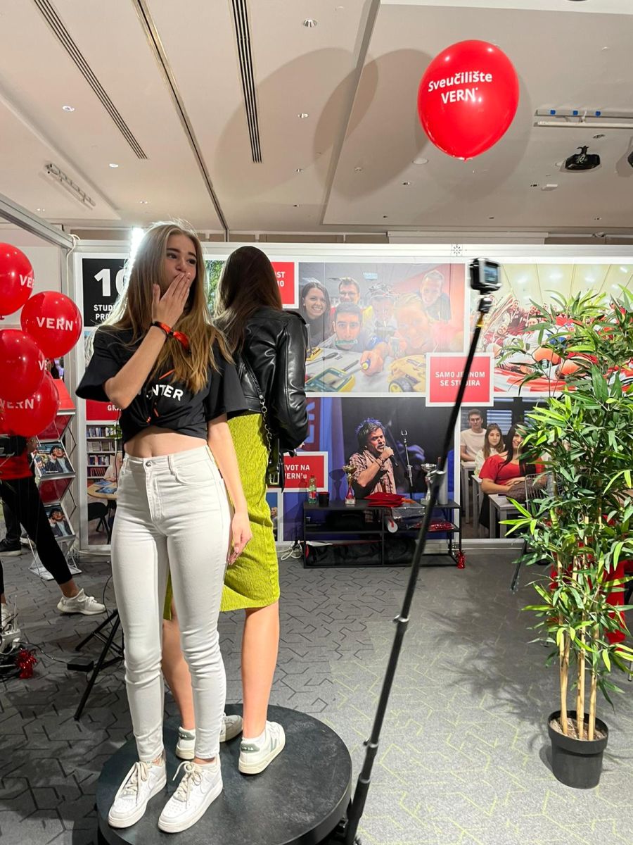 Posjetitelji su se i ove godine uz naše studente mogli informirati, opustiti i zabaviti u VERN’ovom akademsko-izložbenom prostoru, a uz korisne informacije o odabiru budućeg studija i izboru izvannastavnih aktivnosti, svi posjetitelji sa sobom su mogli ponijeti i trajni digitalni capture s VERN’ovog štanda u obliku 360 video GIF-a.