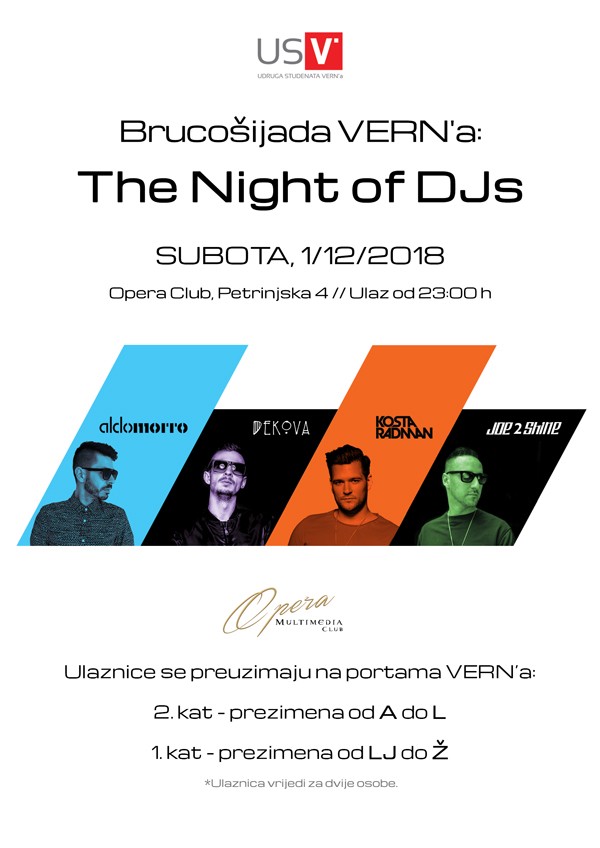 Ulaznice za brucošijadu moći ćete preuzeti od utorka 27. studenoga od 13:30 sati, na portama u prostorima VERN’a u Importanne Galleriji, prema sljedećem rasporedu: