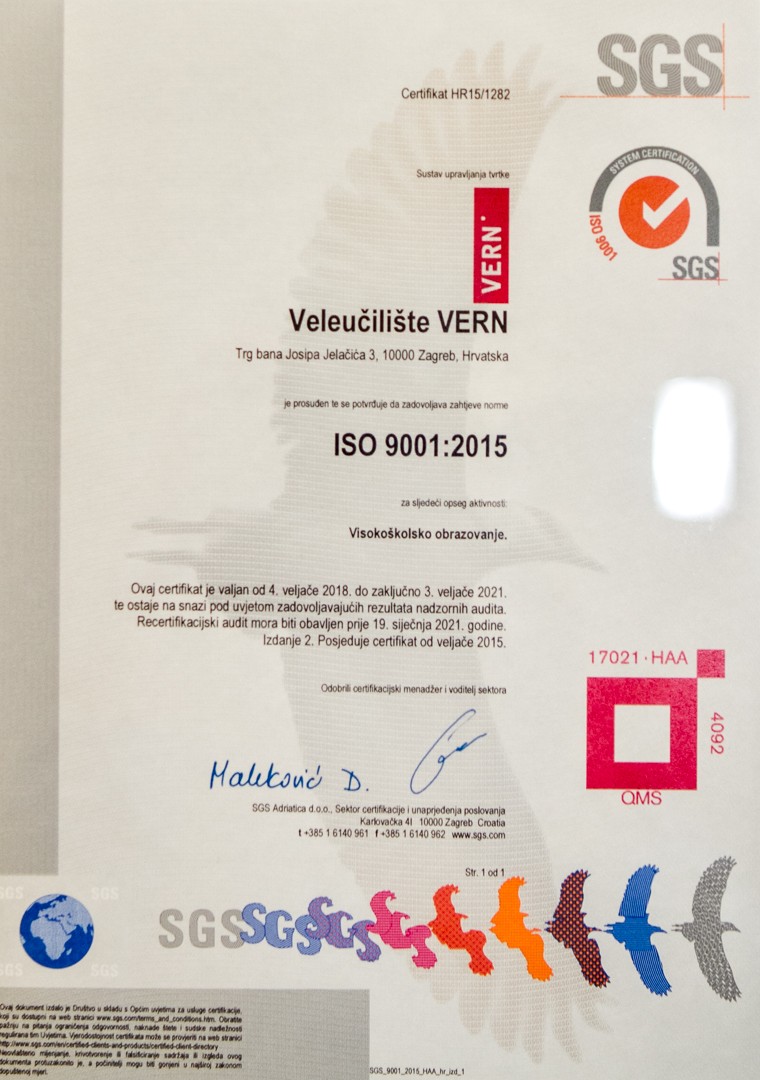 Veleučilištu VERN’ je nakon recertifikacijskog procesa uručen međunarodni certifikat za uspješno upravljanje sustavom kvalitete, prema zahtjevima međunarodne norme ISO 9001:2015.
